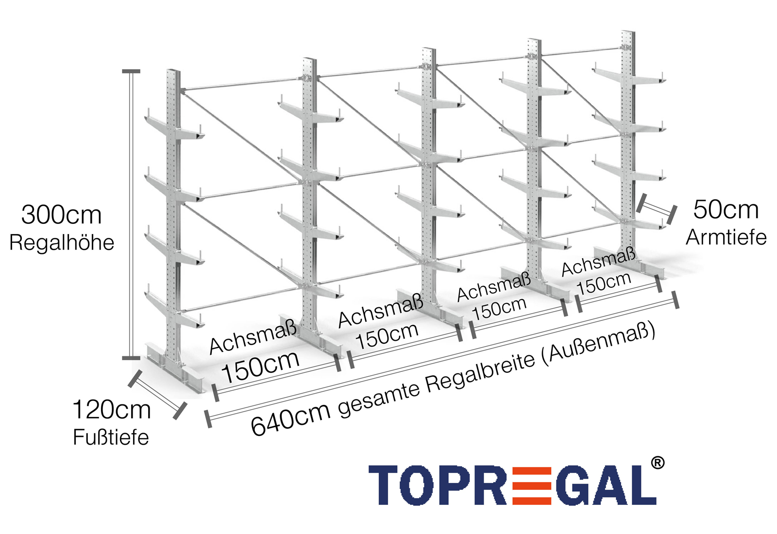 6,4 m cantilever rack KR3000 / Hot-dip galvanised / Double-sided / 3 m high / 50 cm cantilever depth / 4 levels