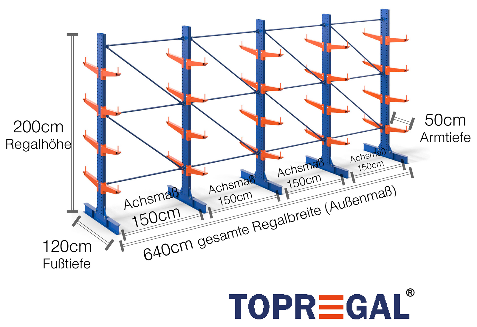 The axial dimension is the internal dimension between two shelf uprights. Depending on the cantilever type, we offer these fields in 120 cm (KR2500) and in 100 cm / 150 cm (KR3000 / KR6000).