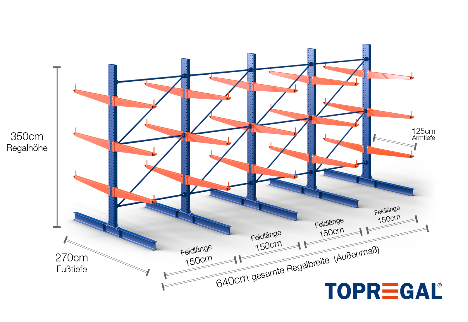 This cantilever rack in a double-sided design with a width of 6,4 m is 3,5 m high, with an overall depth of 270 cm, and features 3 cantilever levels, with a cantilever depth of 125 cm. The maximum load per cantilever is 500 kg. The cantilevers can be attached at individual heights in increments of 50 mm and are secured with safety bolts and pins. The foot parts can also be used as a storage level (depending on the goods). To protect the load from accidentally slipping, roll-off protection can be attached at the end of each cantilever. This is included as standard in the delivery volume. The maximum unit load capacity (even total load between two uprights) is 3.000 kg.