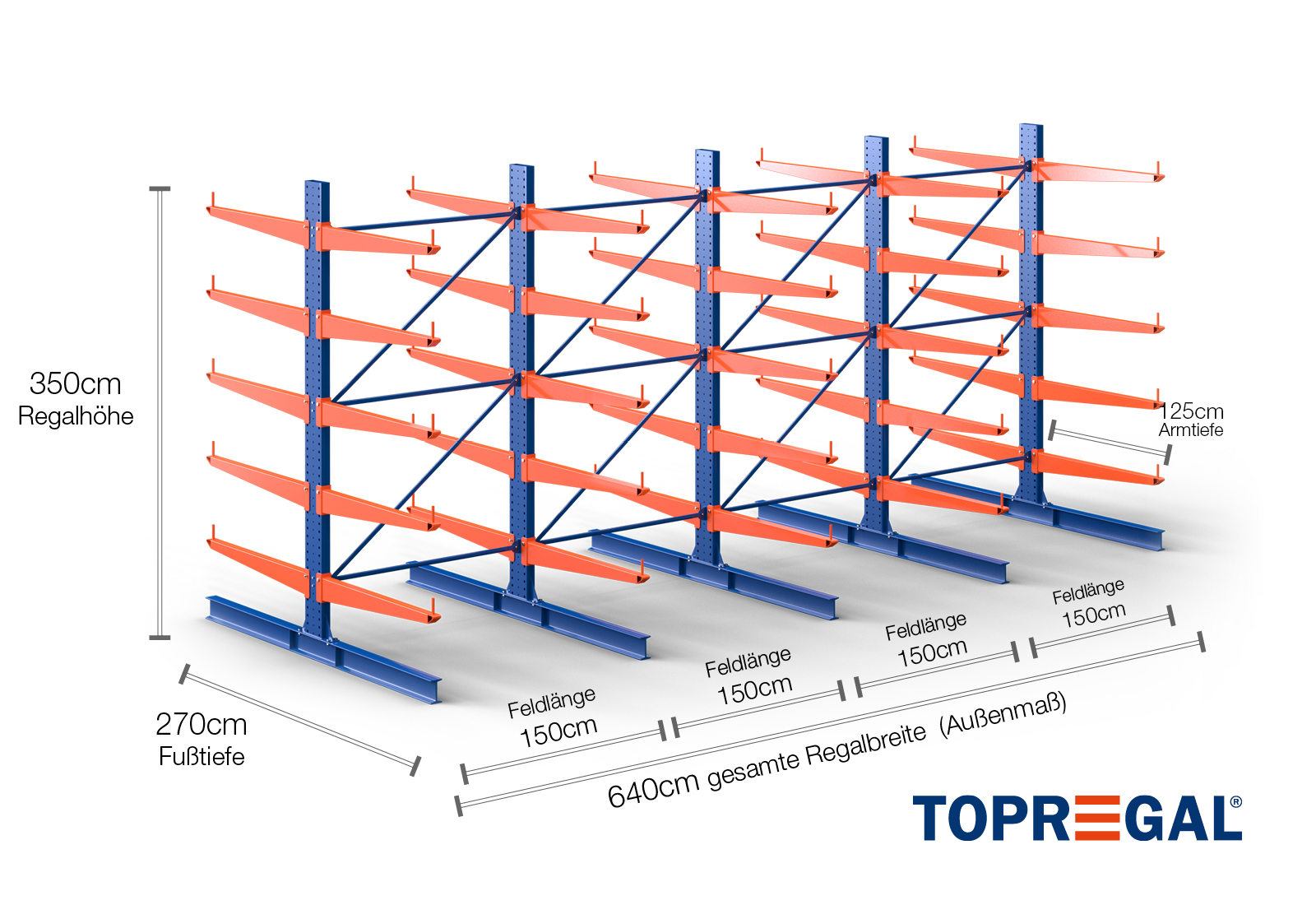 6,4 m cantilever rack KR3000 / Painted / Double-sided / 3,5 m high / 125 cm cantilever depth / 5 levels