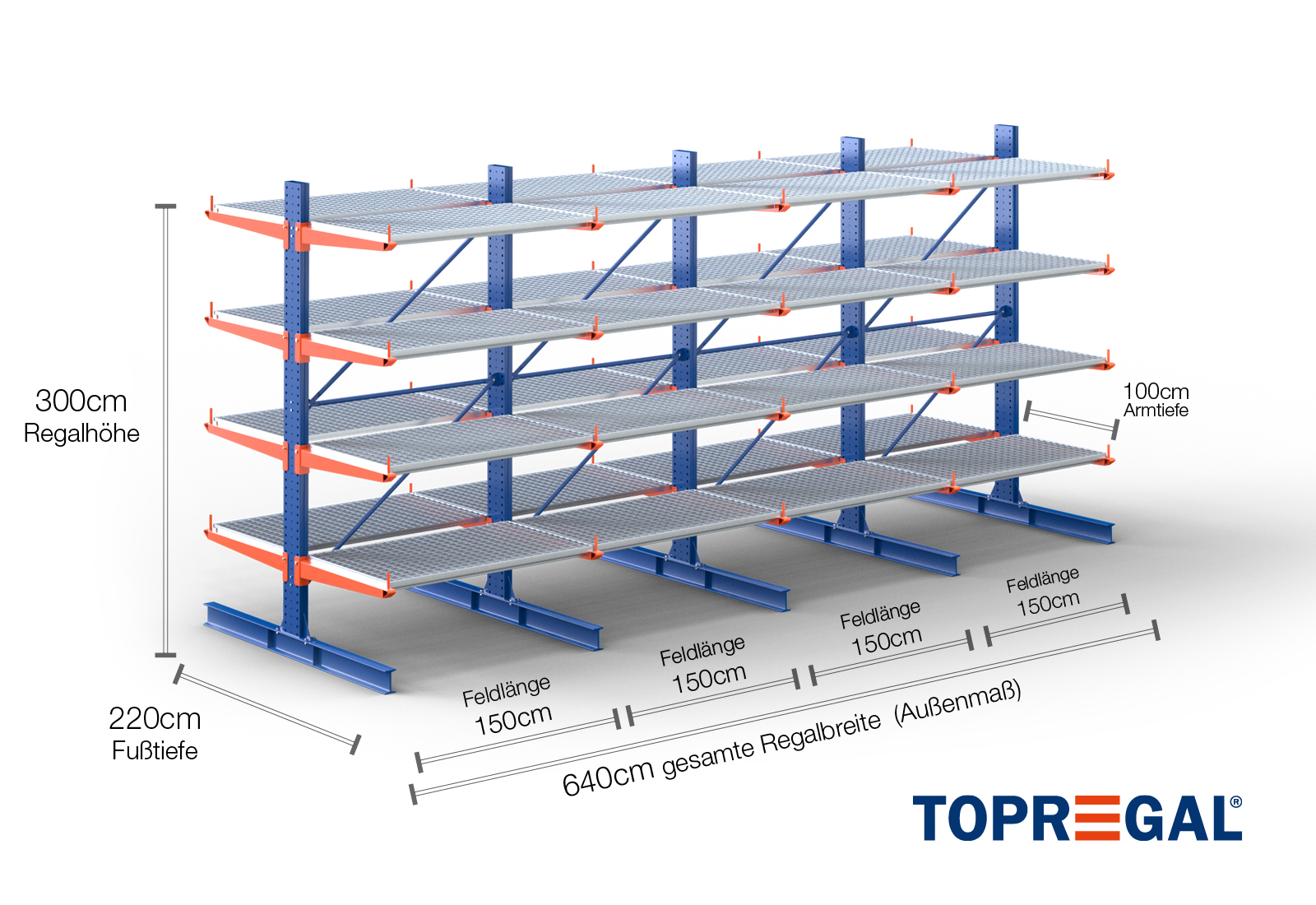 6,4 m cantilever rack KR3000 / Painted / Double-sided / 3 m high / 100 cm cantilever depth / 4 levels / rack layer Galvanised mesh