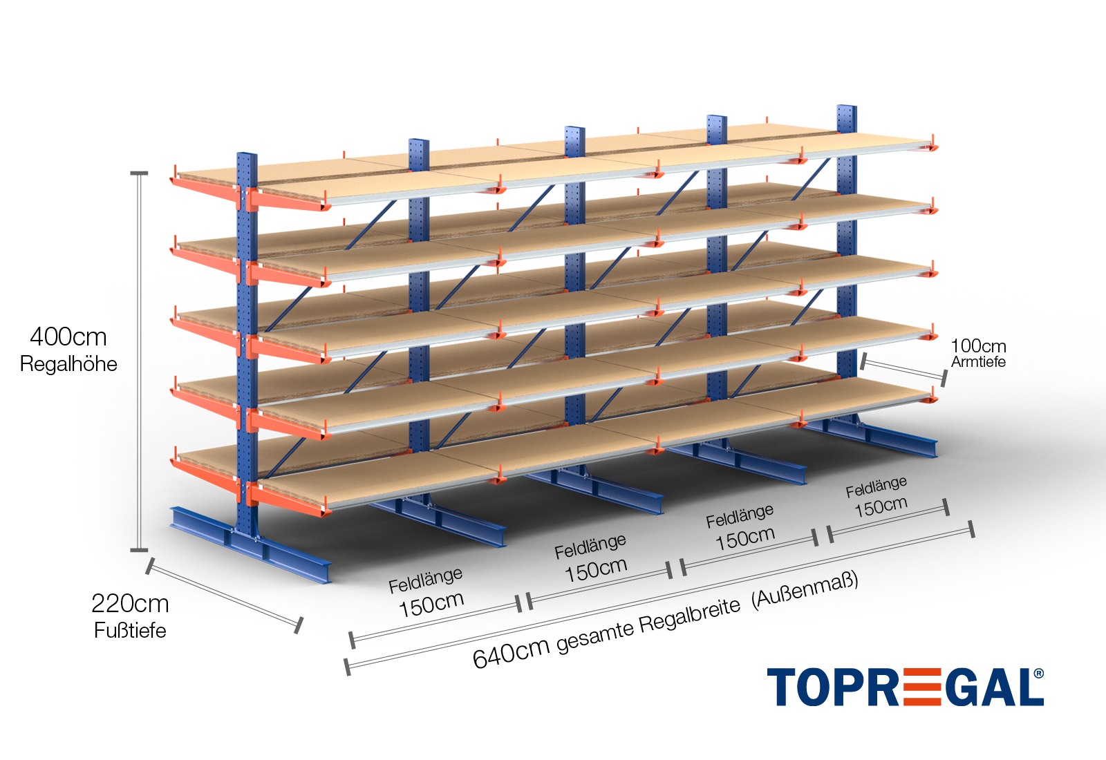 6,4 m cantilever rack KR3000 / Painted / Double-sided / 4 m high / 100 cm cantilever depth / 5 levels / rack layer Wood