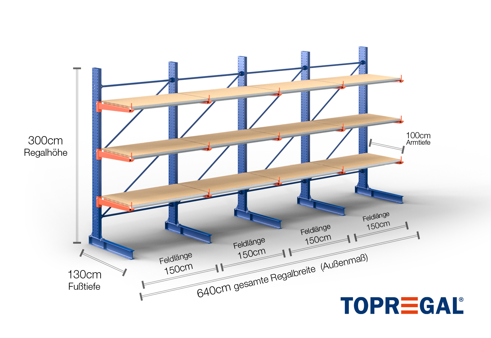 6,4 m cantilever rack KR3000 / Painted / One-sided / 3 m high / 100 cm cantilever depth / 3 levels / rack layer Wood