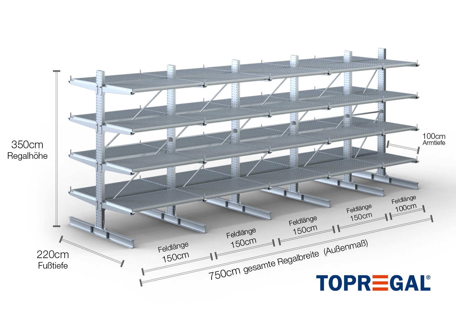 The axial dimension is the internal dimension between two shelf uprights. Depending on the cantilever type, we offer these fields in 120 cm (KR2500) and in 100 cm / 150 cm (KR3000 / KR6000).