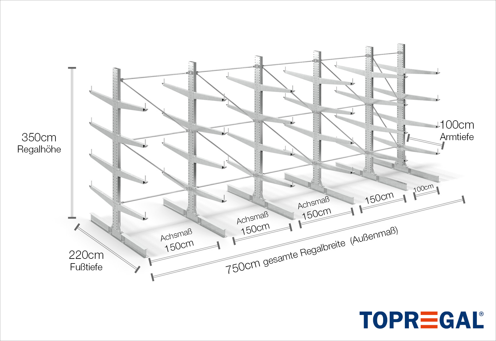 The axial dimension is the internal dimension between two shelf uprights. Depending on the cantilever type, we offer these fields in 120 cm (KR2500) and in 100 cm / 150 cm (KR3000 / KR6000).