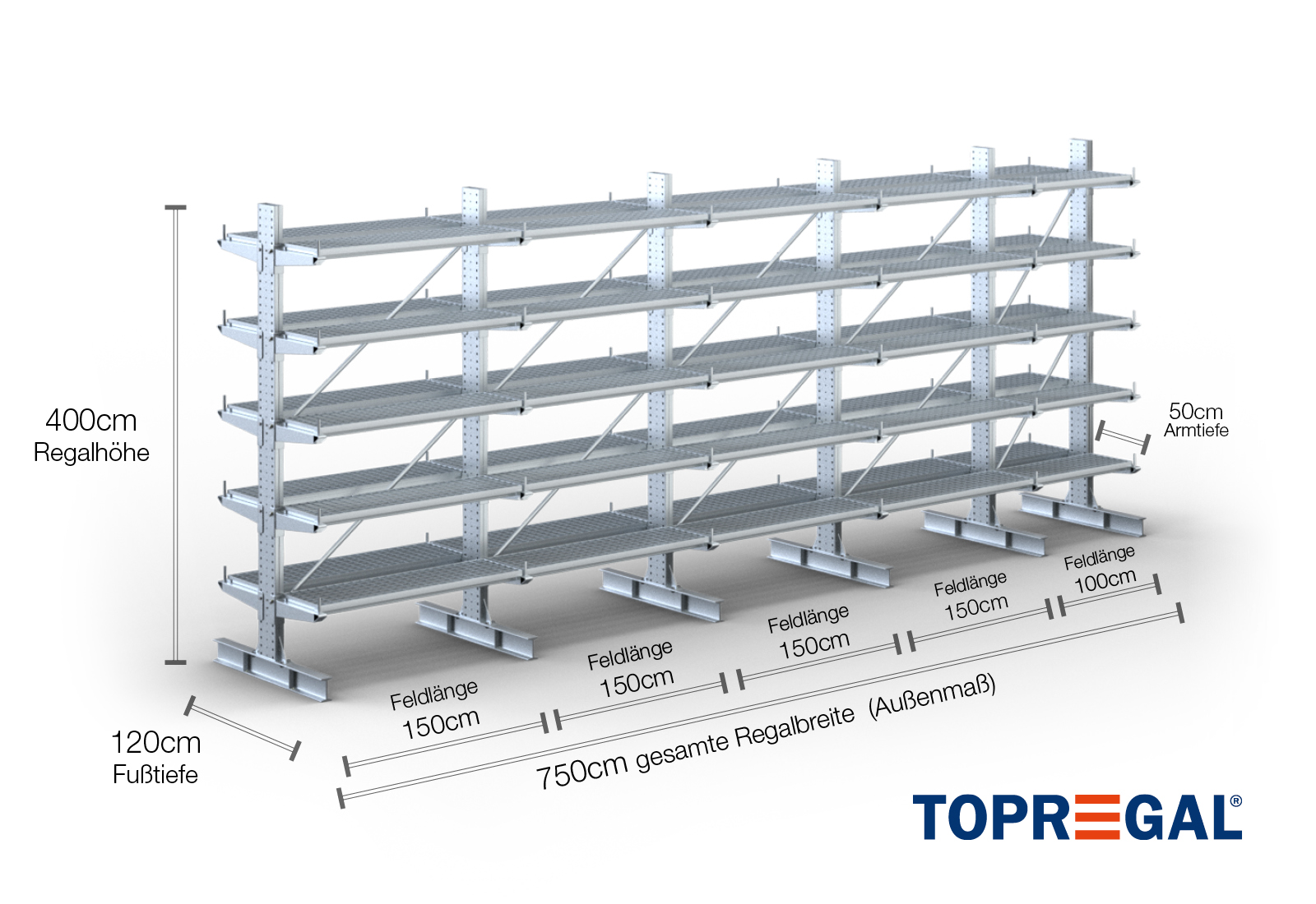 7,5 m cantilever rack KR3000 / Hot-dip galvanised / Double-sided / 4 m high / 50 cm cantilever depth / 5 levels / rack layer Galvanised mesh