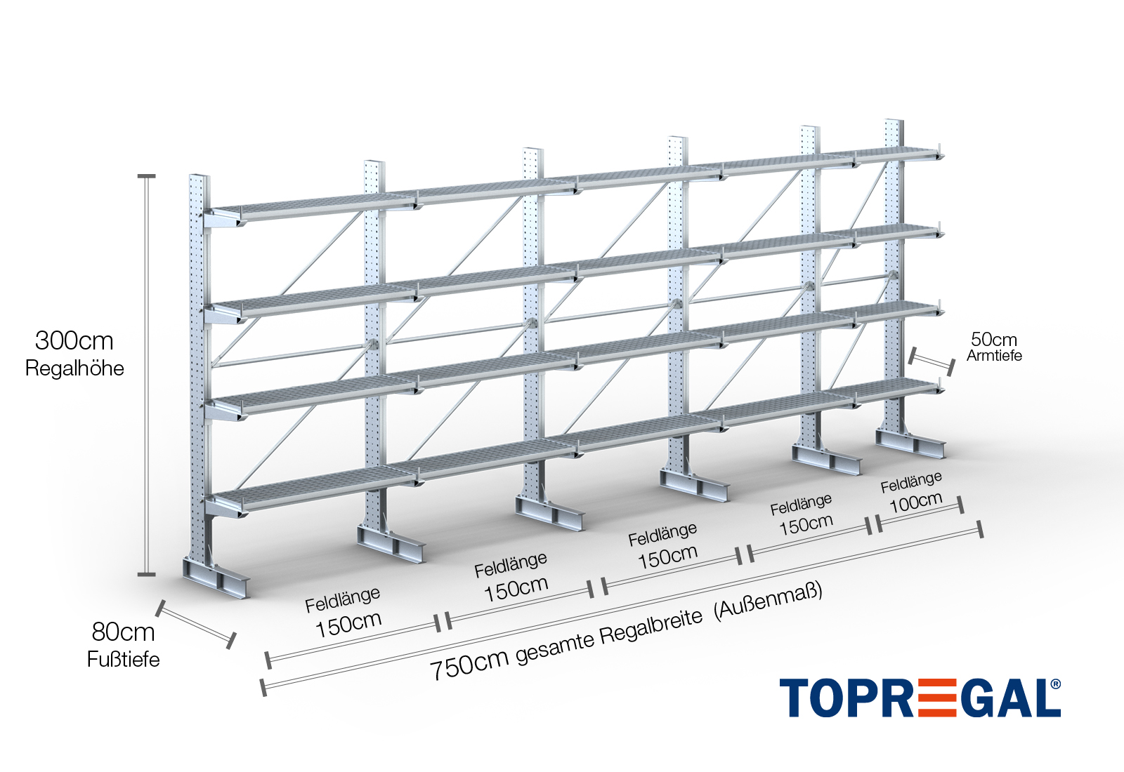 The axial dimension is the internal dimension between two shelf uprights. Depending on the cantilever type, we offer these fields in 120 cm (KR2500) and in 100 cm / 150 cm (KR3000 / KR6000).