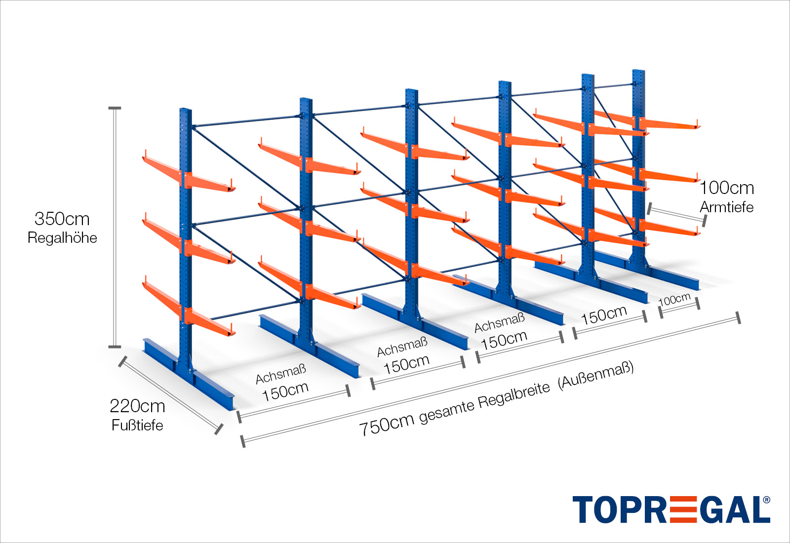 The axial dimension is the internal dimension between two shelf uprights. Depending on the cantilever type, we offer these fields in 120 cm (KR2500) and in 100 cm / 150 cm (KR3000 / KR6000).