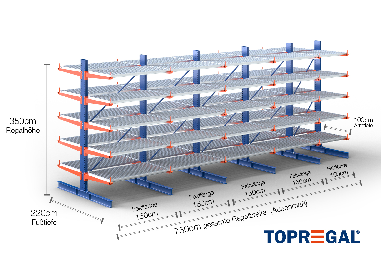 The axial dimension is the internal dimension between two shelf uprights. Depending on the cantilever type, we offer these fields in 120 cm (KR2500) and in 100 cm / 150 cm (KR3000 / KR6000).