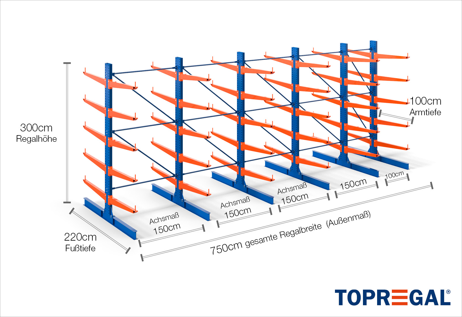 The axial dimension is the internal dimension between two shelf uprights. Depending on the cantilever type, we offer these fields in 120 cm (KR2500) and in 100 cm / 150 cm (KR3000 / KR6000).