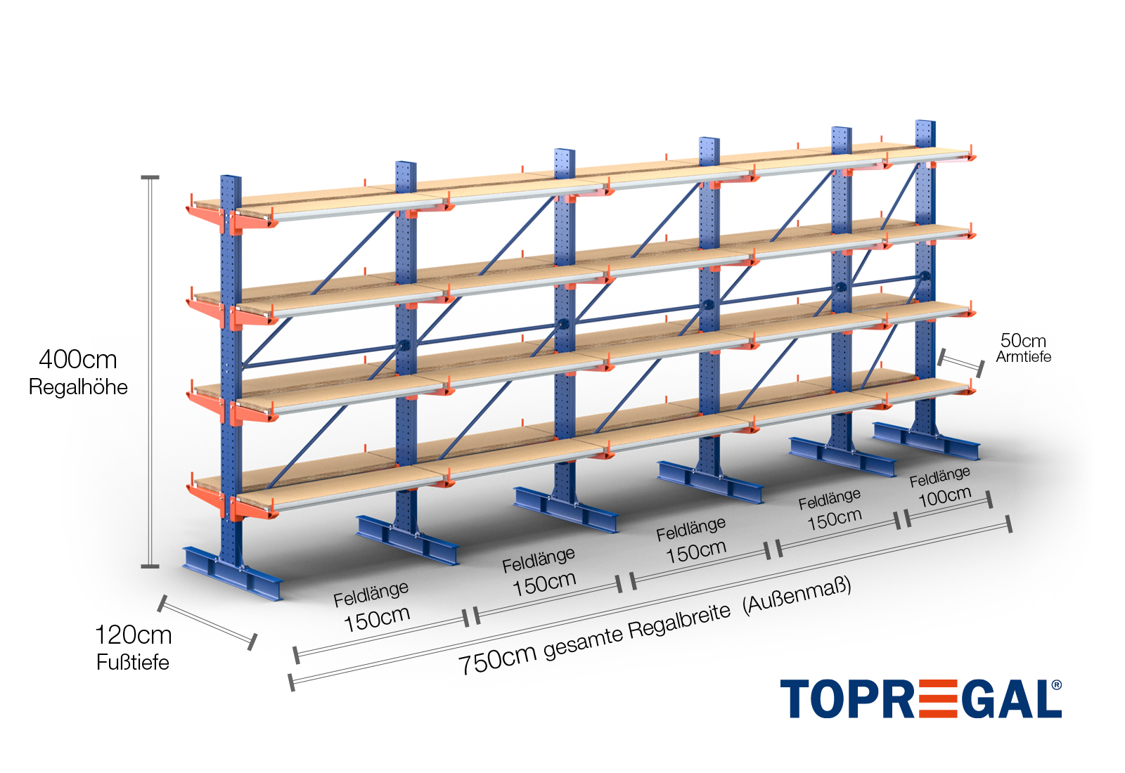 The axial dimension is the internal dimension between two shelf uprights. Depending on the cantilever type, we offer these fields in 120 cm (KR2500) and in 100 cm / 150 cm (KR3000 / KR6000).