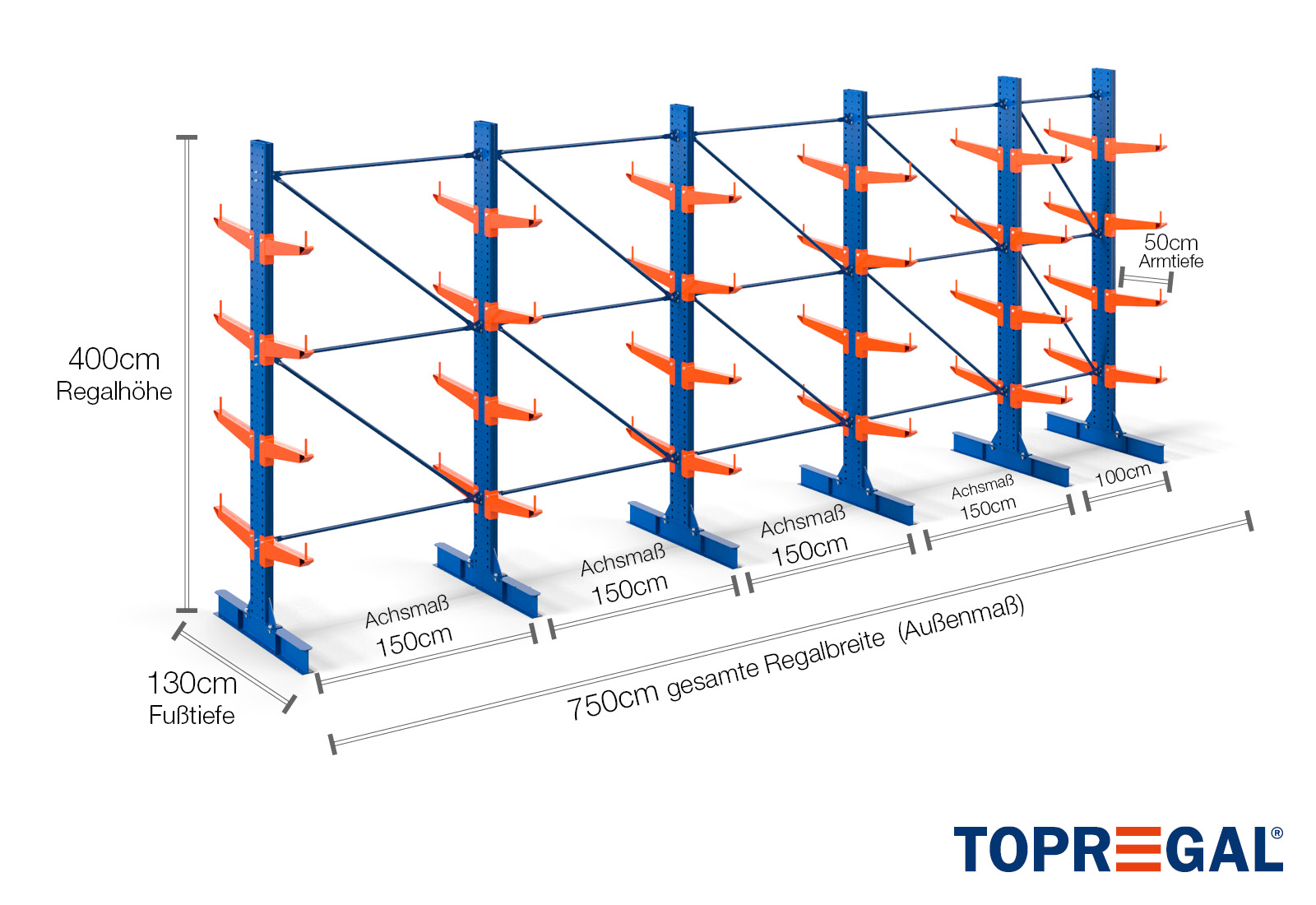 The axial dimension is the internal dimension between two shelf uprights. Depending on the cantilever type, we offer these fields in 120 cm (KR2500) and in 100 cm / 150 cm (KR3000 / KR6000).