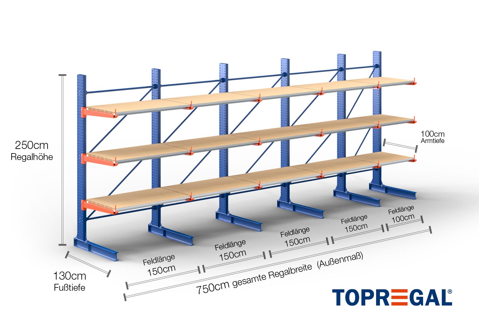7,5 m cantilever rack KR3000 / Painted / One-sided / 2,5 m high / 100 cm cantilever depth / 3 levels / rack layer Wood