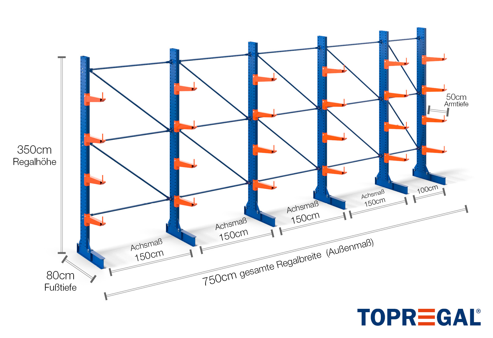 The axial dimension is the internal dimension between two shelf uprights. Depending on the cantilever type, we offer these fields in 120 cm (KR2500) and in 100 cm / 150 cm (KR3000 / KR6000).