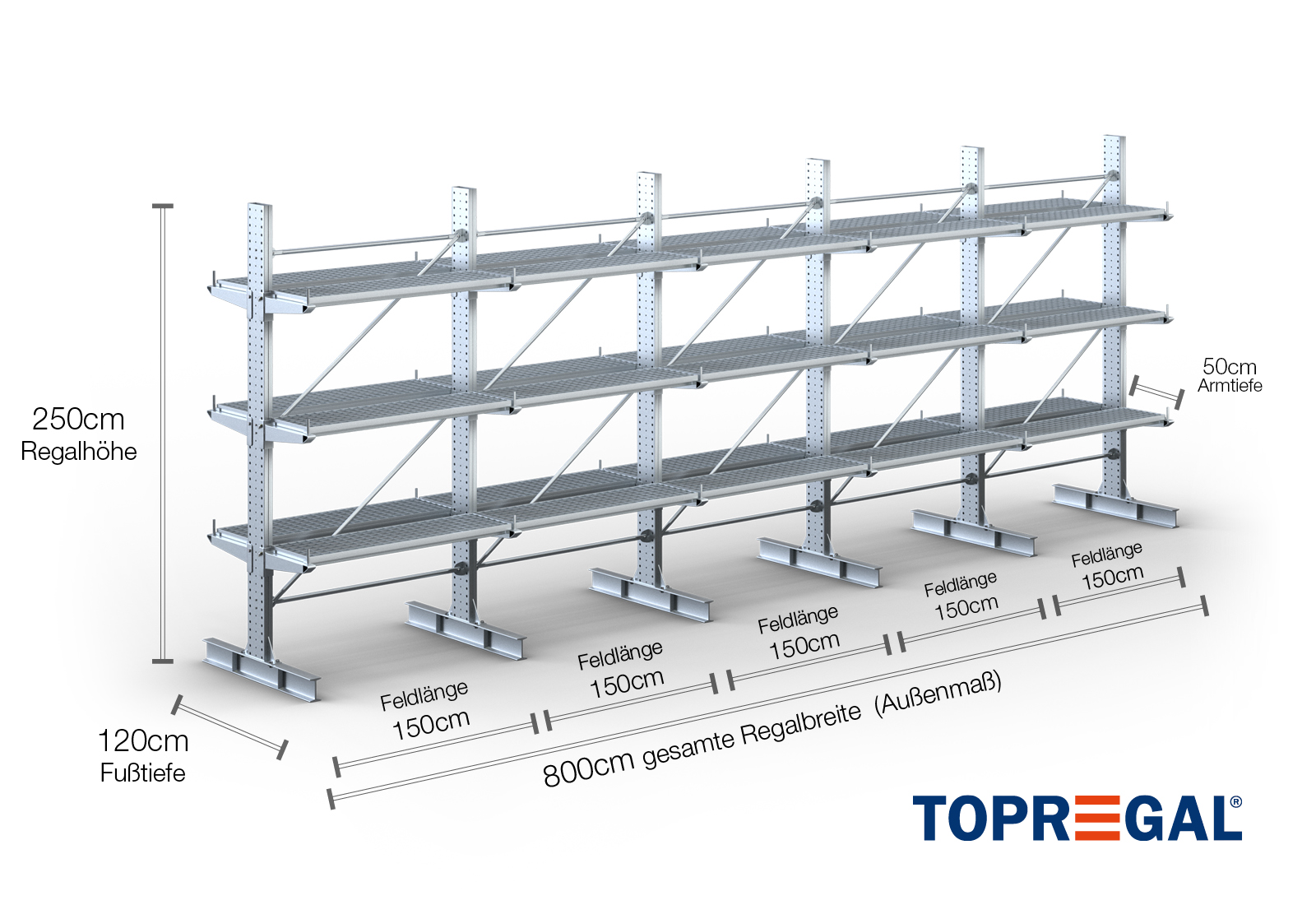 The axial dimension is the internal dimension between two shelf uprights. Depending on the cantilever type, we offer these fields in 120 cm (KR2500) and in 100 cm / 150 cm (KR3000 / KR6000).