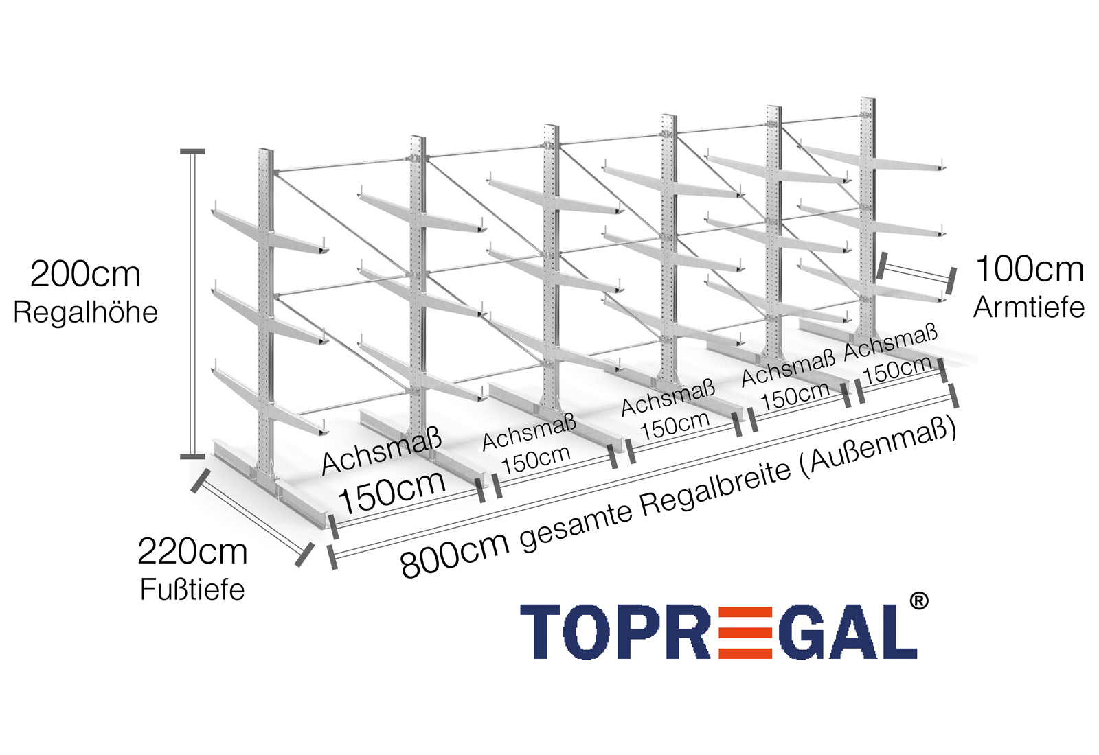 The axial dimension is the internal dimension between two shelf uprights. Depending on the cantilever type, we offer these fields in 120 cm (KR2500) and in 100 cm / 150 cm (KR3000 / KR6000).