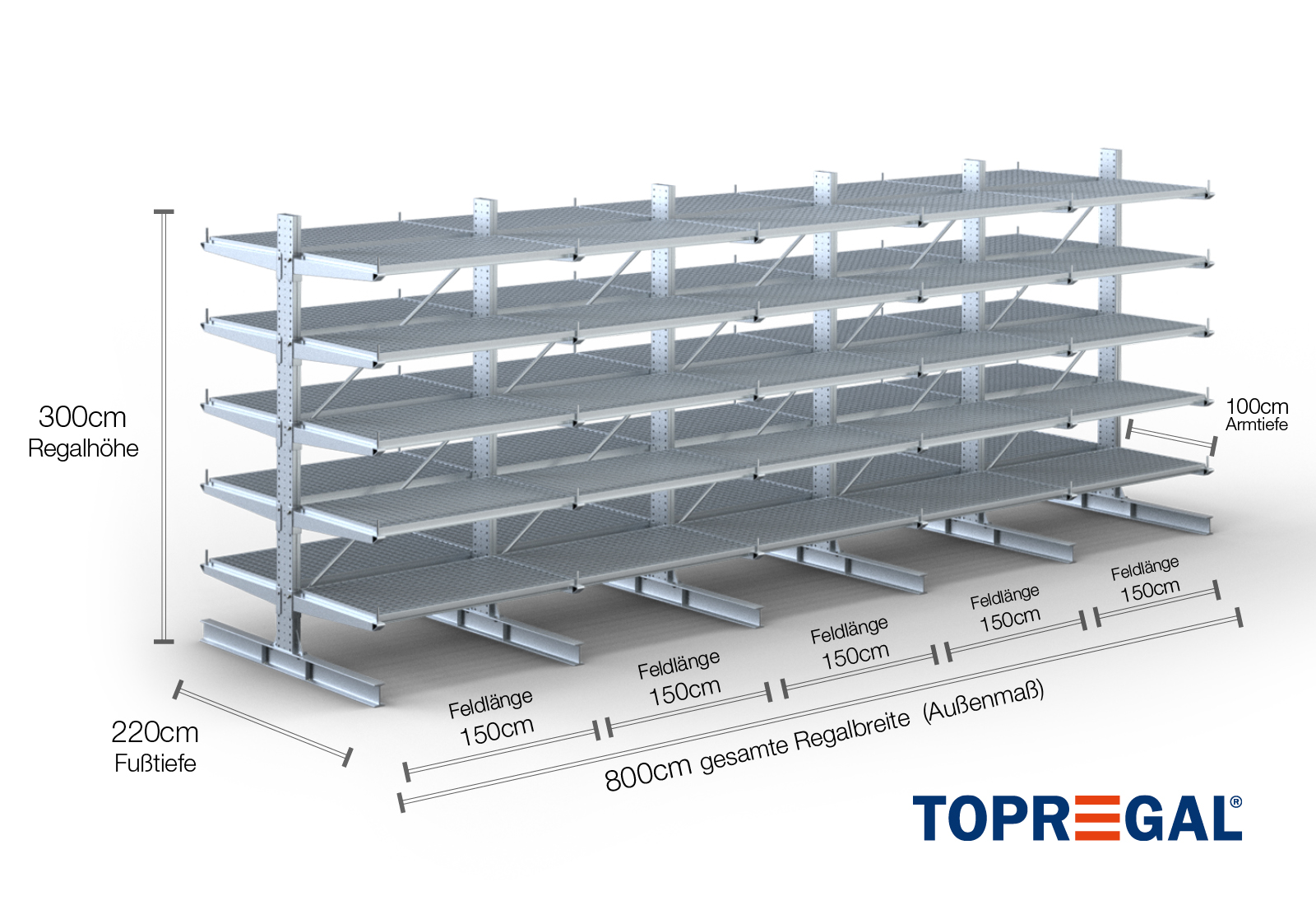 The axial dimension is the internal dimension between two shelf uprights. Depending on the cantilever type, we offer these fields in 120 cm (KR2500) and in 100 cm / 150 cm (KR3000 / KR6000).