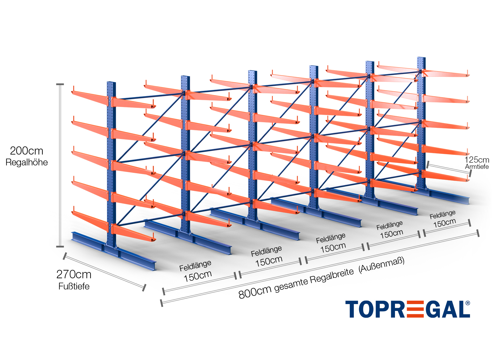 This cantilever rack in a double-sided design with a width of 8 m is 2 m high, with an overall depth of 270 cm, and features 5 cantilever levels, with a cantilever depth of 125 cm. The maximum load per cantilever is 500 kg. The cantilevers can be attached at individual heights in increments of 50 mm and are secured with safety bolts and pins. The foot parts can also be used as a storage level (depending on the goods). To protect the load from accidentally slipping, roll-off protection can be attached at the end of each cantilever. This is included as standard in the delivery volume. The maximum unit load capacity (even total load between two uprights) is 3.000 kg.