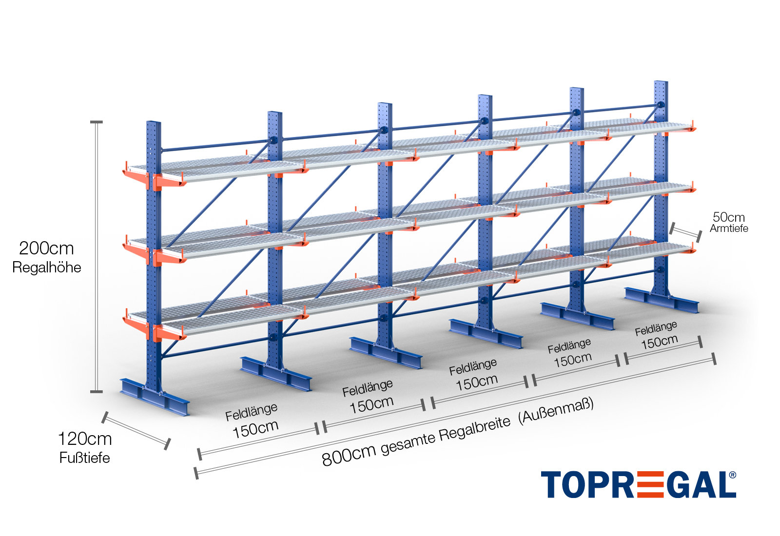 The axial dimension is the internal dimension between two shelf uprights. Depending on the cantilever type, we offer these fields in 120 cm (KR2500) and in 100 cm / 150 cm (KR3000 / KR6000).