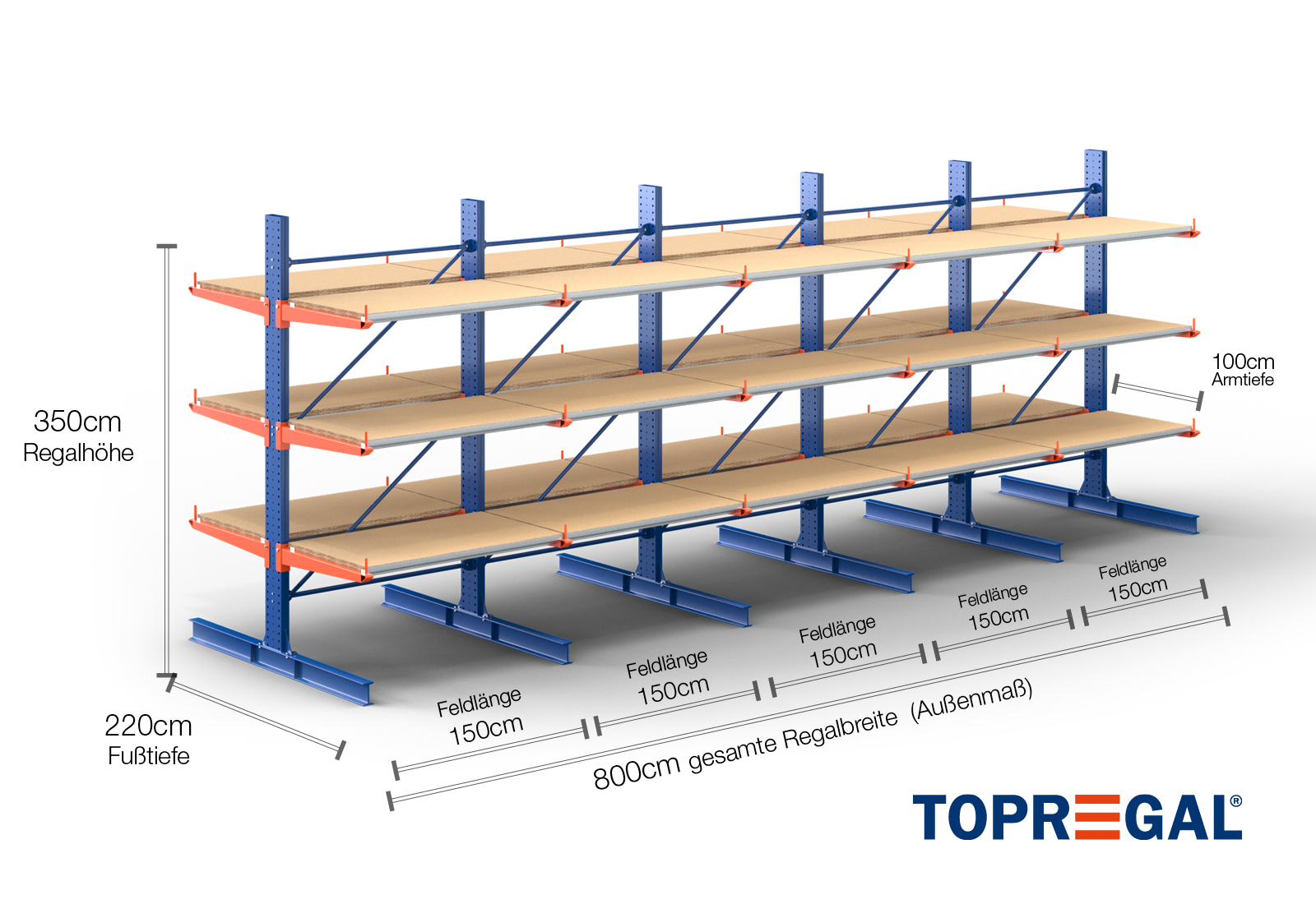 The axial dimension is the internal dimension between two shelf uprights. Depending on the cantilever type, we offer these fields in 120 cm (KR2500) and in 100 cm / 150 cm (KR3000 / KR6000).