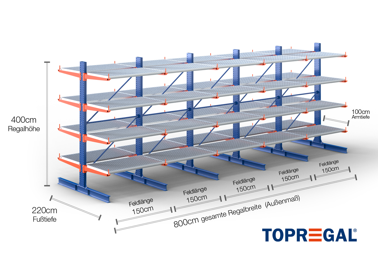 The axial dimension is the internal dimension between two shelf uprights. Depending on the cantilever type, we offer these fields in 120 cm (KR2500) and in 100 cm / 150 cm (KR3000 / KR6000).