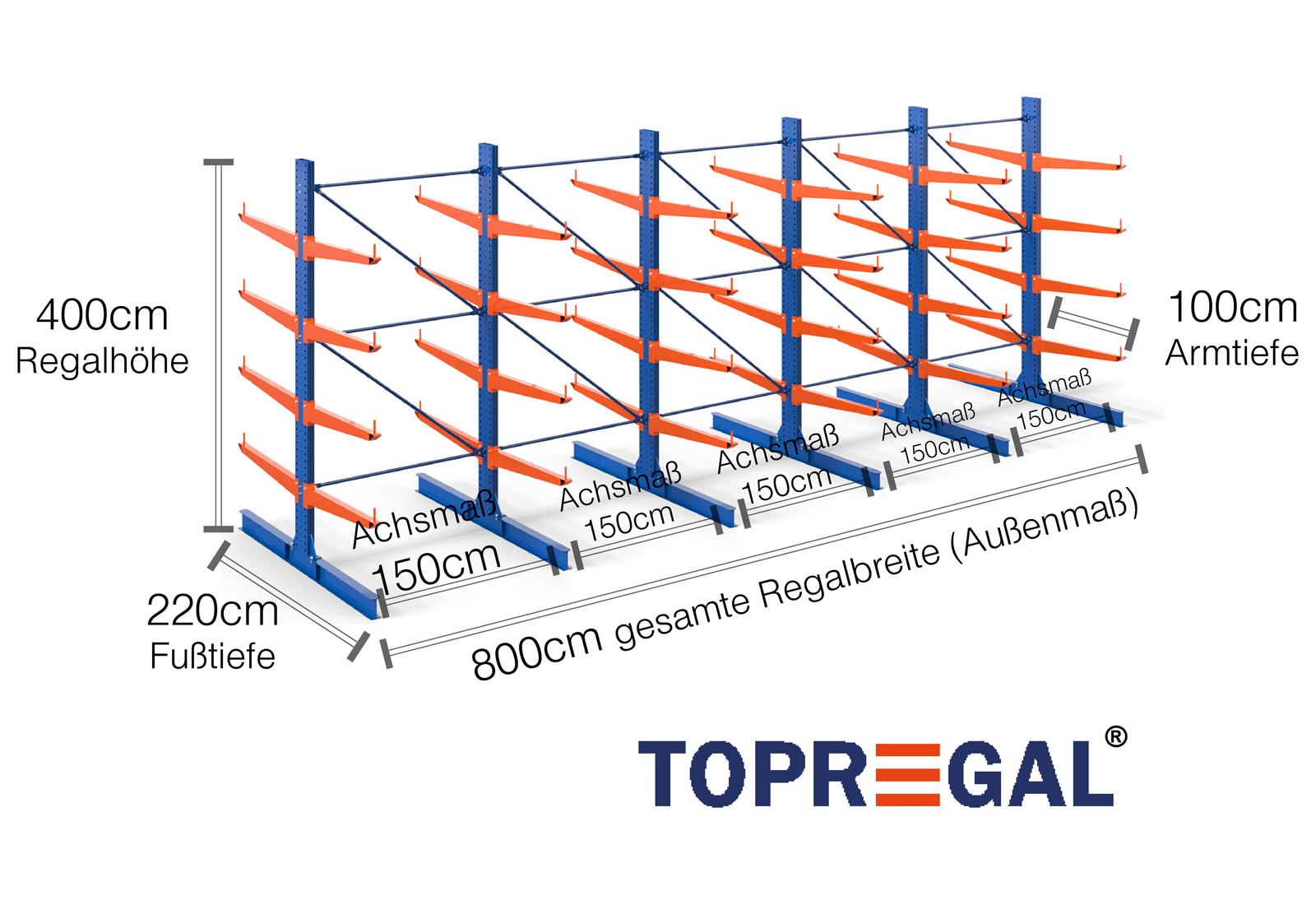 The axial dimension is the internal dimension between two shelf uprights. Depending on the cantilever type, we offer these fields in 120 cm (KR2500) and in 100 cm / 150 cm (KR3000 / KR6000).