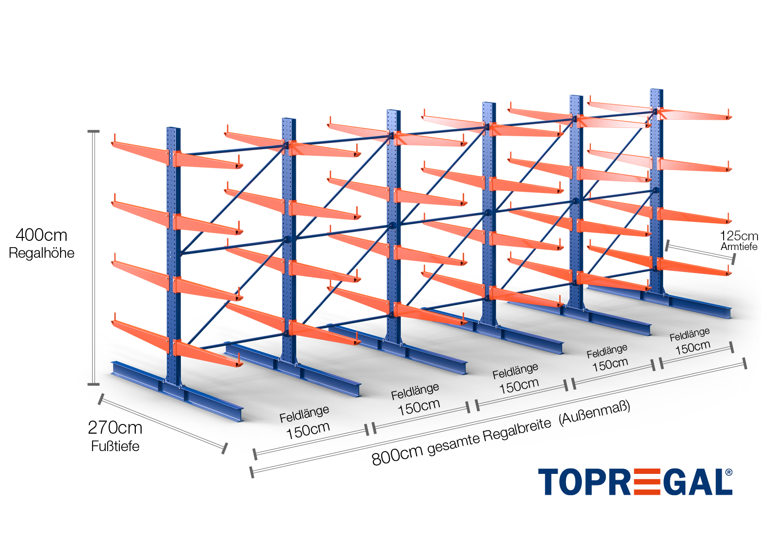 This cantilever rack in a double-sided design with a width of 8 m is 4 m high, with an overall depth of 270 cm, and features 4 cantilever levels, with a cantilever depth of 125 cm. The maximum load per cantilever is 500 kg. The cantilevers can be attached at individual heights in increments of 50 mm and are secured with safety bolts and pins. The foot parts can also be used as a storage level (depending on the goods). To protect the load from accidentally slipping, roll-off protection can be attached at the end of each cantilever. This is included as standard in the delivery volume. The maximum unit load capacity (even total load between two uprights) is 3.000 kg.