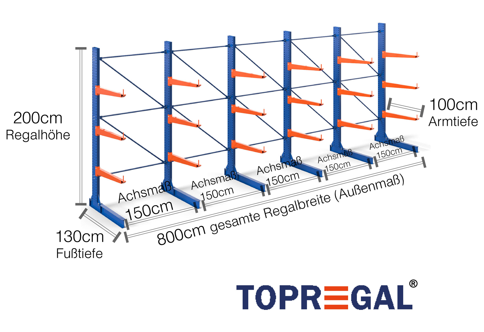 The axial dimension is the internal dimension between two shelf uprights. Depending on the cantilever type, we offer these fields in 120 cm (KR2500) and in 100 cm / 150 cm (KR3000 / KR6000).