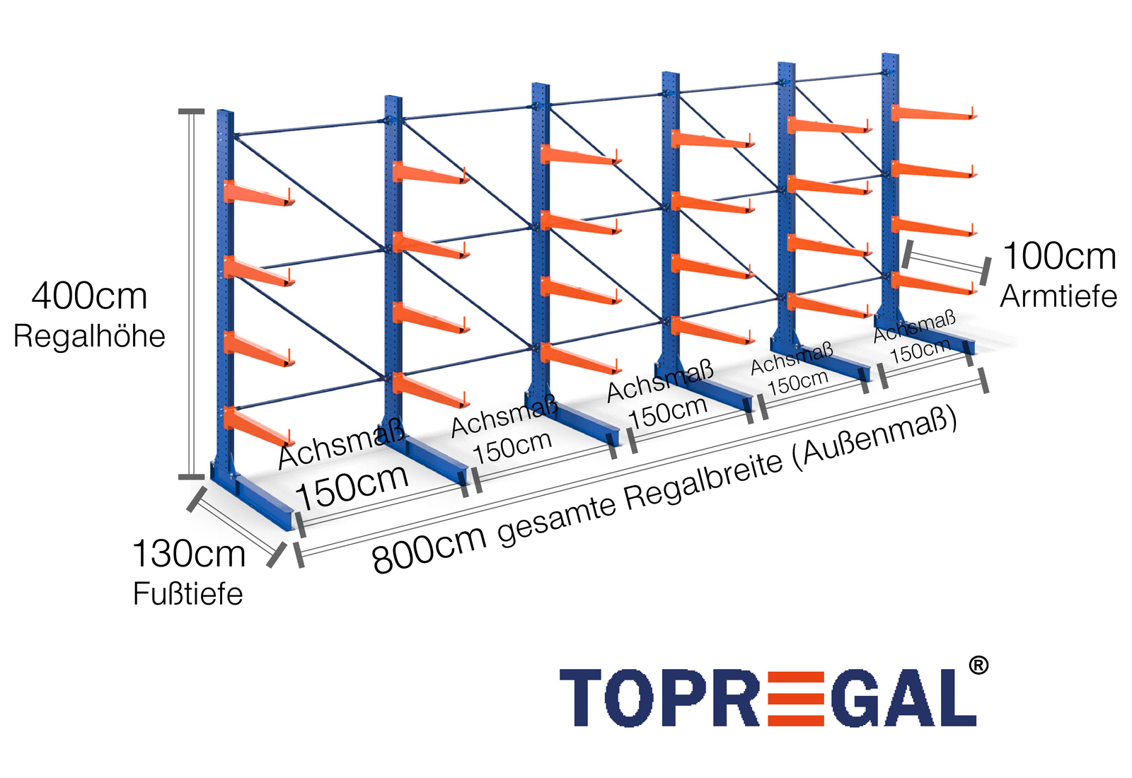 8 m cantilever rack KR3000 / Painted / One-sided / 100 cm cantilever depth / 4 m high / 4 levels
