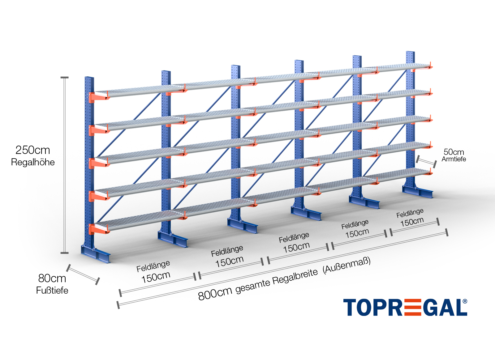 8 m cantilever rack KR3000 / Painted / One-sided / 2,5 m high / 5 levels / 50 cm cantilever depth / rack layer Galvanised mesh