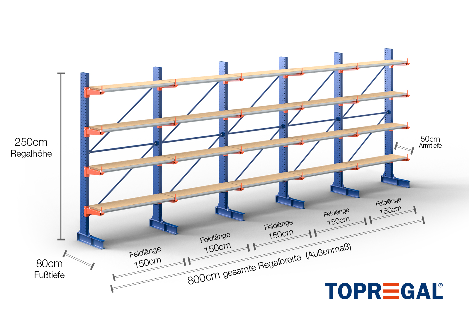 8 m cantilever rack KR3000 / Painted / One-sided / 2,5 m high / 50 cm cantilever depth / 4 levels / rack layer Wood