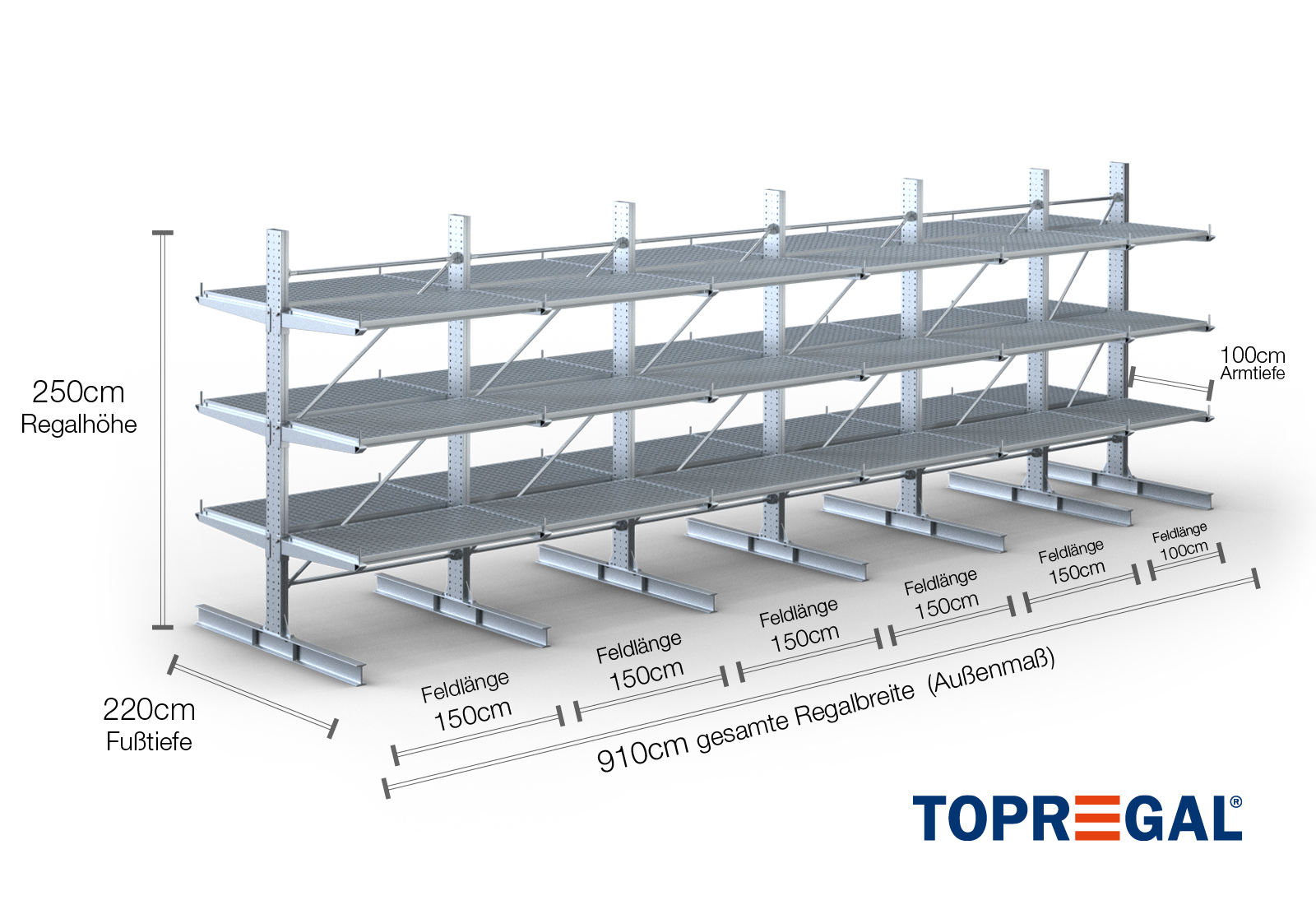 This cantilever rack in a double-sided design with a width of 9,1 m is 2,5 m high, with an overall depth of 220 cm, and features 3 cantilever levels, with a cantilever depth of 100 cm. The maximum load per cantilever is 500 kg. The cantilevers can be attached at individual heights in increments of 50 mm and are secured with safety bolts and pins. The foot parts can also be used as a storage level (depending on the goods). To protect the load from accidentally slipping, roll-off protection can be attached at the end of each cantilever. This is included as standard in the delivery volume. The maximum unit load capacity (even total load between two uprights) is 3.000 kg.