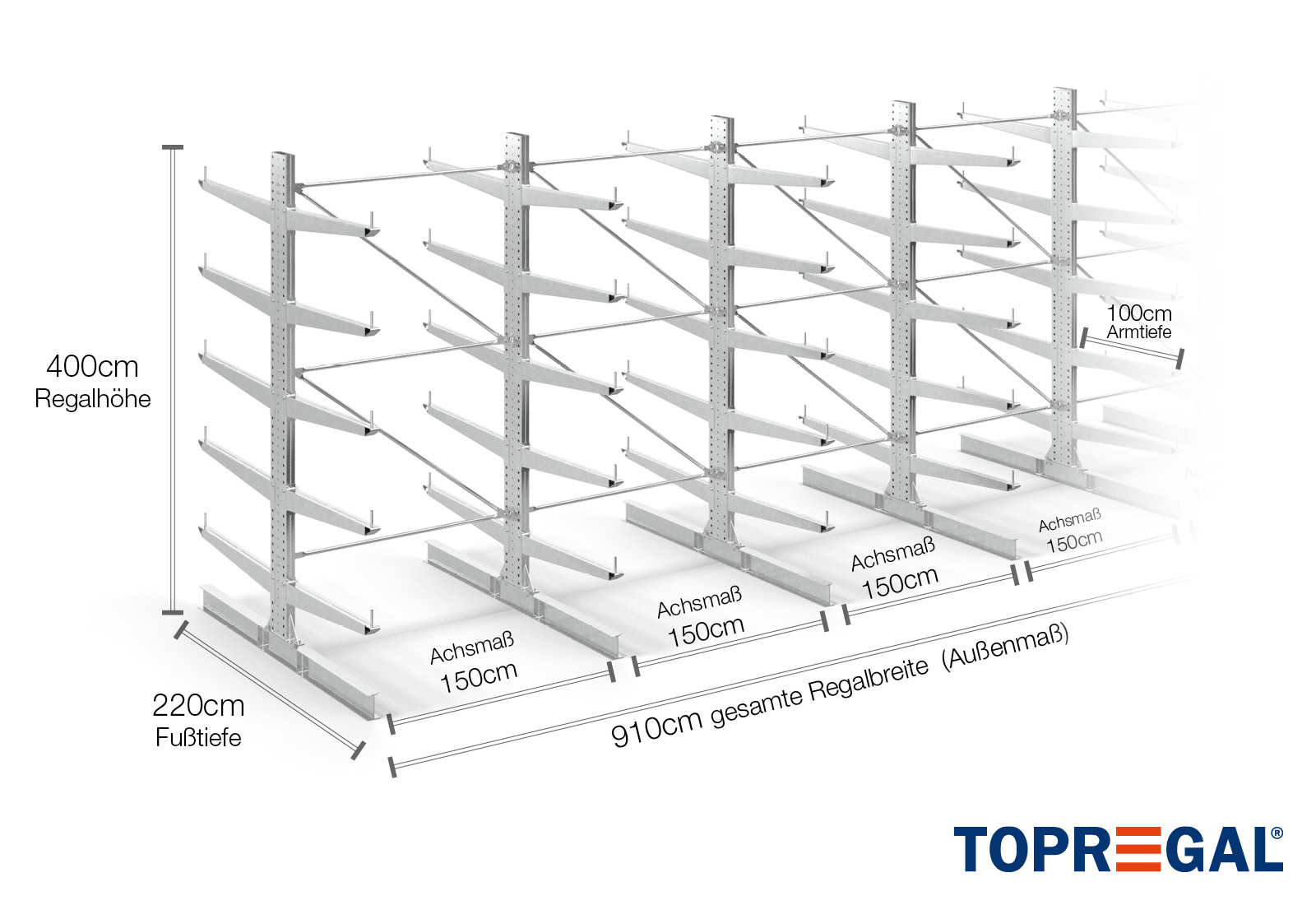 The axial dimension is the internal dimension between two shelf uprights. Depending on the cantilever type, we offer these fields in 120 cm (KR2500) and in 100 cm / 150 cm (KR3000 / KR6000).