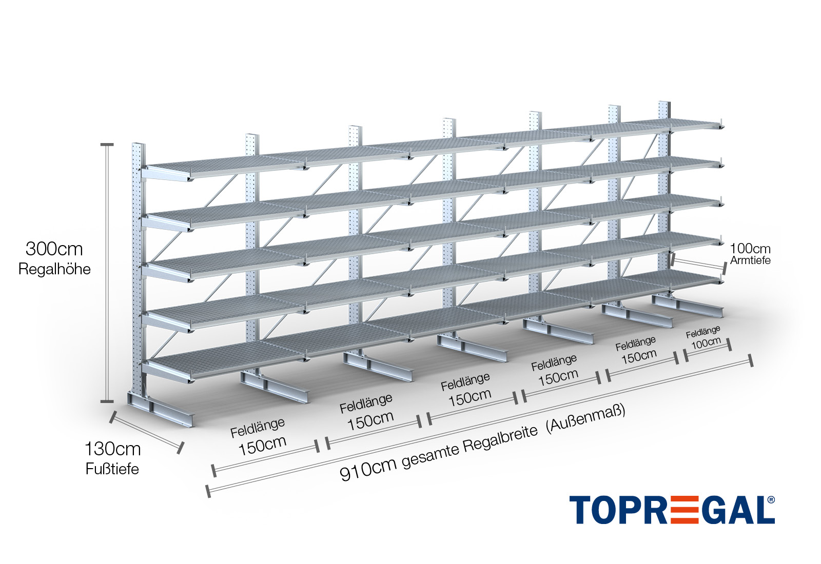 This cantilever rack in a single-sided design with a width of 9,1 m is 3 m high, with an overall depth of 130 cm, and features 5 cantilever levels, with a cantilever depth of 100 cm. The maximum load per cantilever is 500 kg. The cantilevers can be attached at individual heights in increments of 50 mm and are secured with safety bolts and pins. The foot parts can also be used as a storage level (depending on the goods). To protect the load from accidentally slipping, roll-off protection can be attached at the end of each cantilever. This is included as standard in the delivery volume.