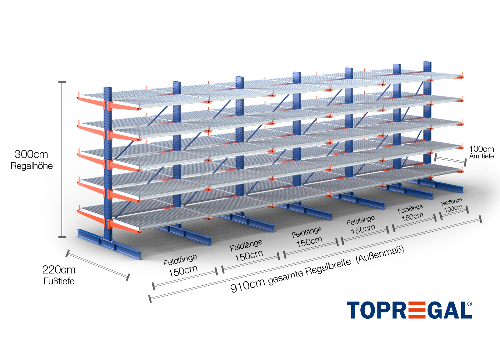 The axial dimension is the internal dimension between two shelf uprights. Depending on the cantilever type, we offer these fields in 120 cm (KR2500) and in 100 cm / 150 cm (KR3000 / KR6000).