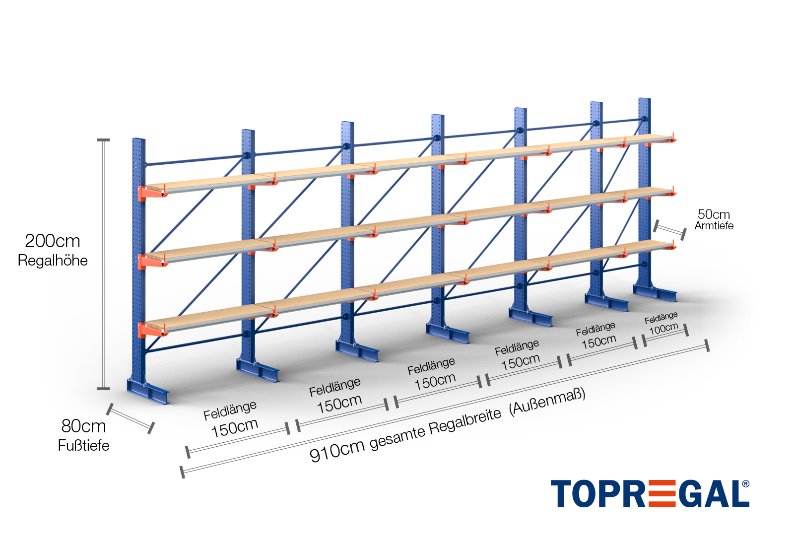 This cantilever rack in a single-sided design with a width of 9,1 m is 2 m high, with an overall depth of 80 cm, and features 3 cantilever levels, with a cantilever depth of 50 cm. The maximum load per cantilever is 500 kg. The cantilevers can be attached at individual heights in increments of 50 mm and are secured with safety bolts and pins. The foot parts can also be used as a storage level (depending on the goods). To protect the load from accidentally slipping, roll-off protection can be attached at the end of each cantilever. This is included as standard in the delivery volume.