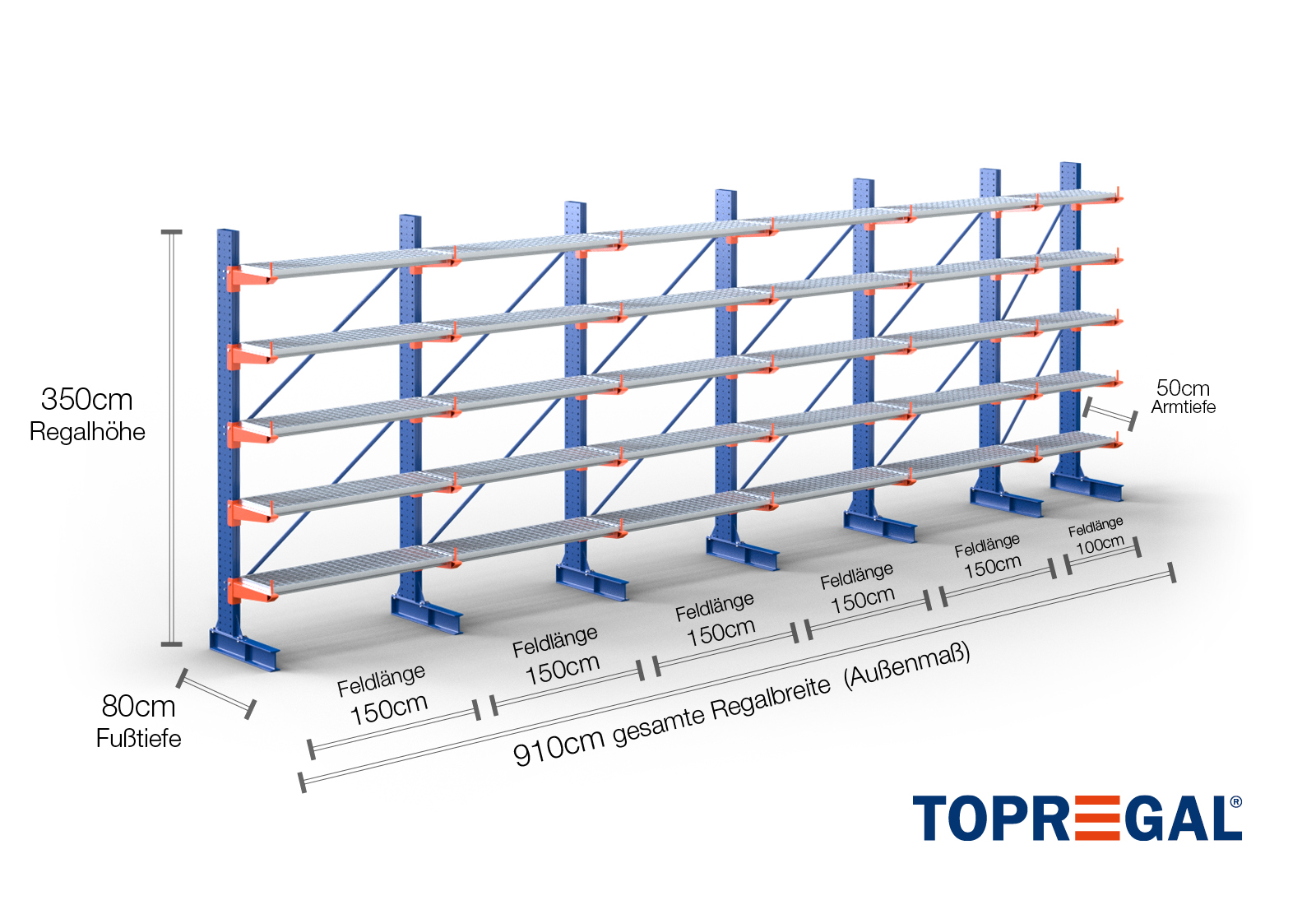 The axial dimension is the internal dimension between two shelf uprights. Depending on the cantilever type, we offer these fields in 120 cm (KR2500) and in 100 cm / 150 cm (KR3000 / KR6000).