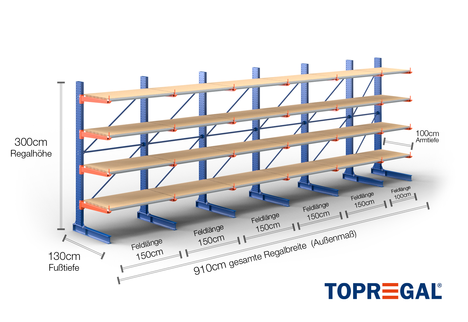The axial dimension is the internal dimension between two shelf uprights. Depending on the cantilever type, we offer these fields in 120 cm (KR2500) and in 100 cm / 150 cm (KR3000 / KR6000).