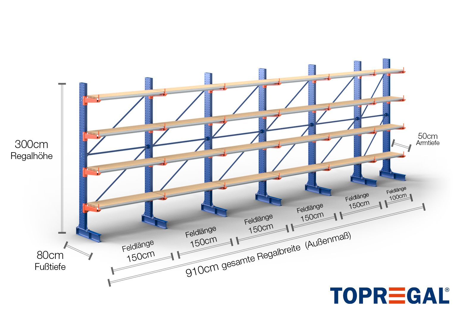 9,1 m cantilever rack KR3000 / Painted / One-sided / 3 m high / 50 cm cantilever depth / 4 levels / rack layer Wood
