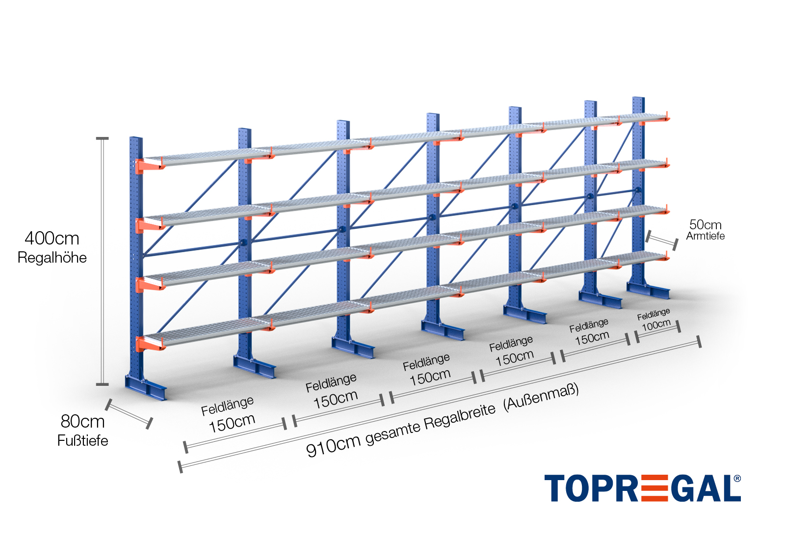 9,1 m cantilever rack KR3000 / Painted / One-sided / 4 m high / 4 levels / 50 cm cantilever depth / rack layer Galvanised mesh