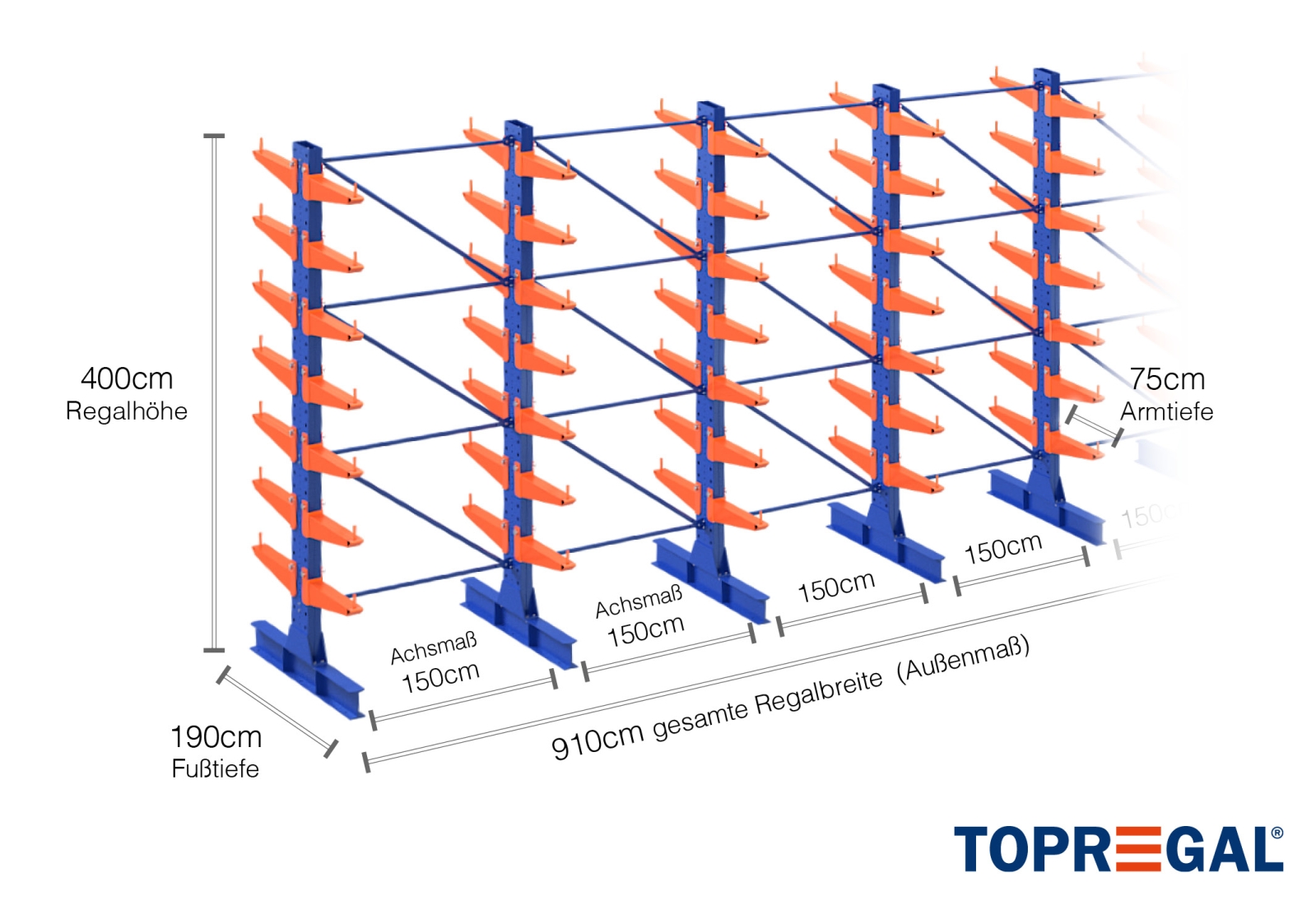 9,1 m cantilever rack KR6000 / Painted / Double-sided / 4 m high / 75 cm cantilever depth / 7 levels