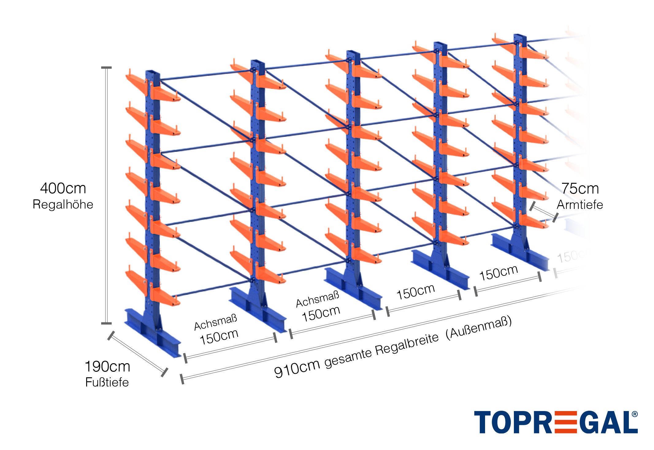 The axial dimension is the internal dimension between two shelf uprights. Depending on the cantilever type, we offer these fields in 120 cm (KR2500) and in 100 cm / 150 cm (KR3000 / KR6000).
