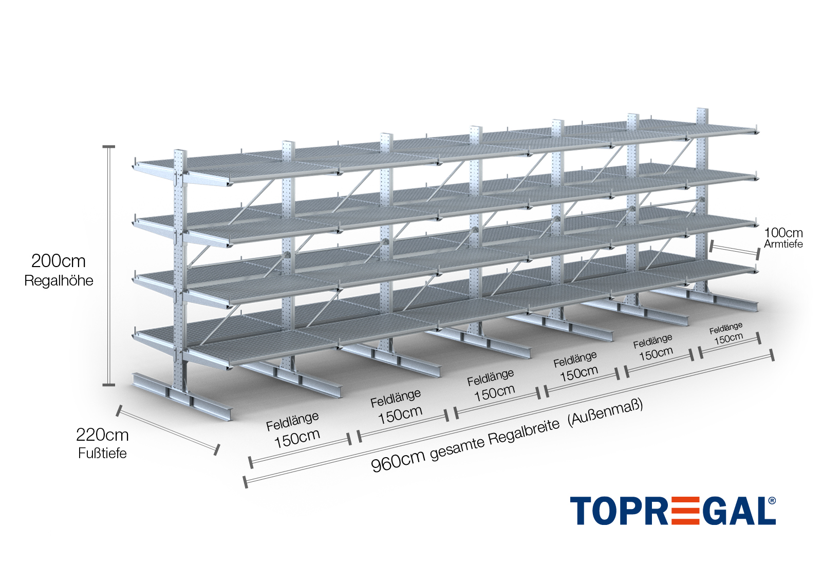 9,6 m cantilever rack KR3000 / Hot-dip galvanised / Double-sided / 2 m high / 100 cm cantilever depth / 4 levels / rack layer Galvanised mesh