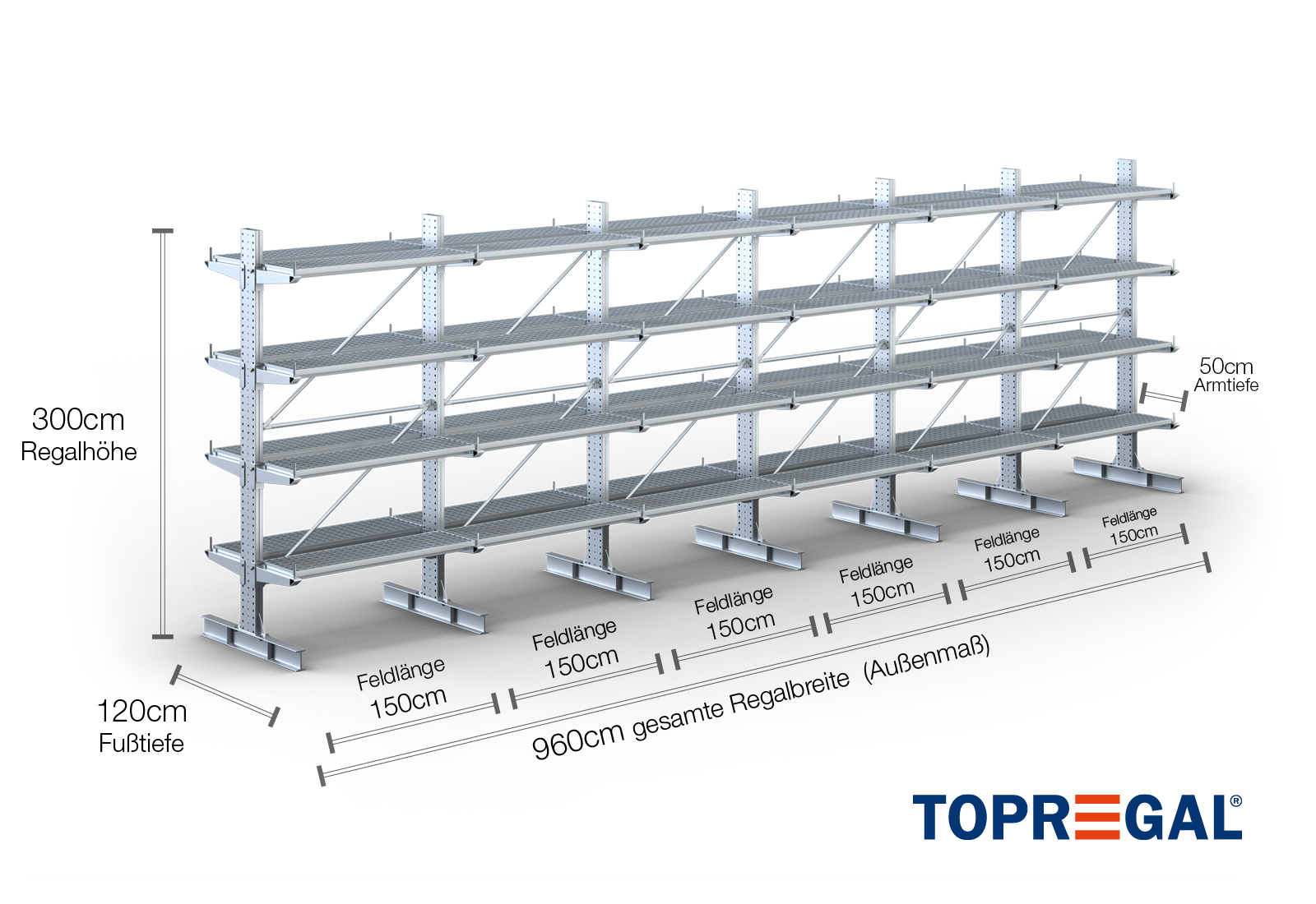 9,6 m cantilever rack KR3000 / Hot-dip galvanised / Double-sided / 3 m high / 50 cm cantilever depth / 4 levels / rack layer Galvanised mesh