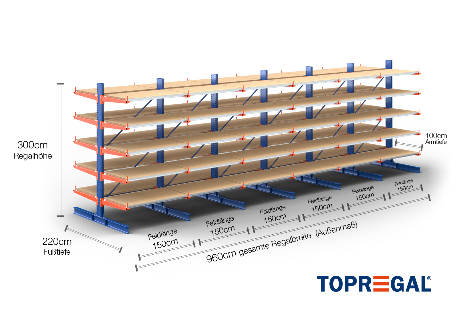 9,6 m cantilever rack KR3000 / Painted / Double-sided / 3 m high / 100 cm cantilever depth / 5 levels / rack layer Wood