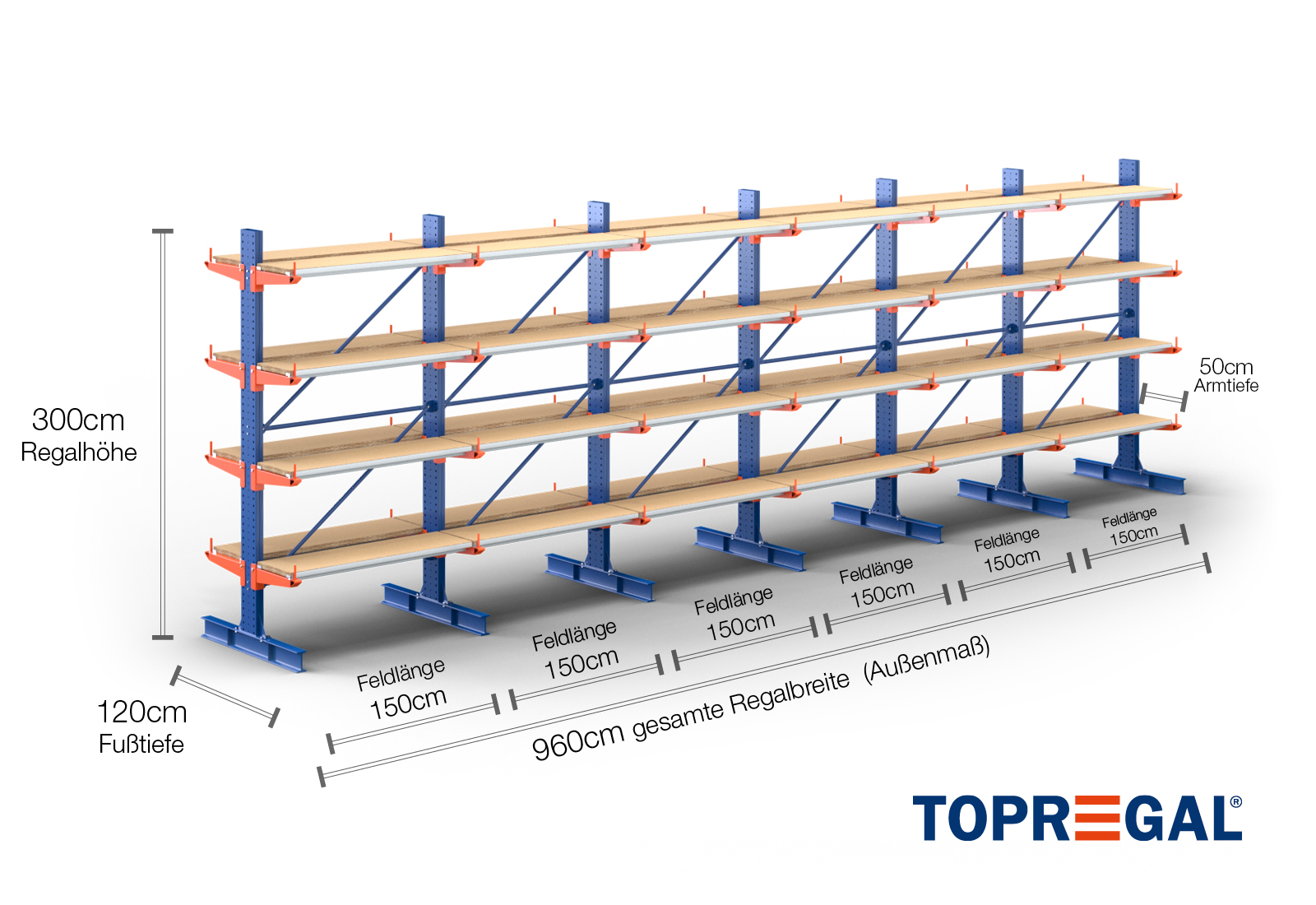 The axial dimension is the internal dimension between two shelf uprights. Depending on the cantilever type, we offer these fields in 120 cm (KR2500) and in 100 cm / 150 cm (KR3000 / KR6000).