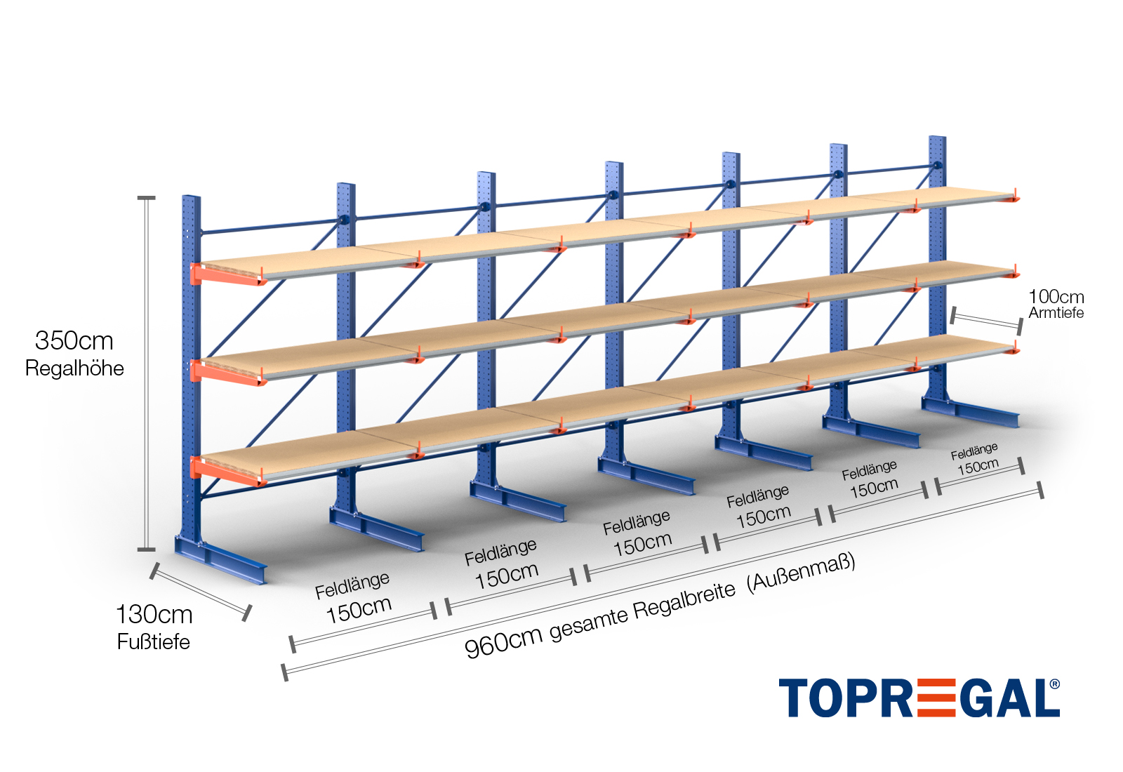 The axial dimension is the internal dimension between two shelf uprights. Depending on the cantilever type, we offer these fields in 120 cm (KR2500) and in 100 cm / 150 cm (KR3000 / KR6000).