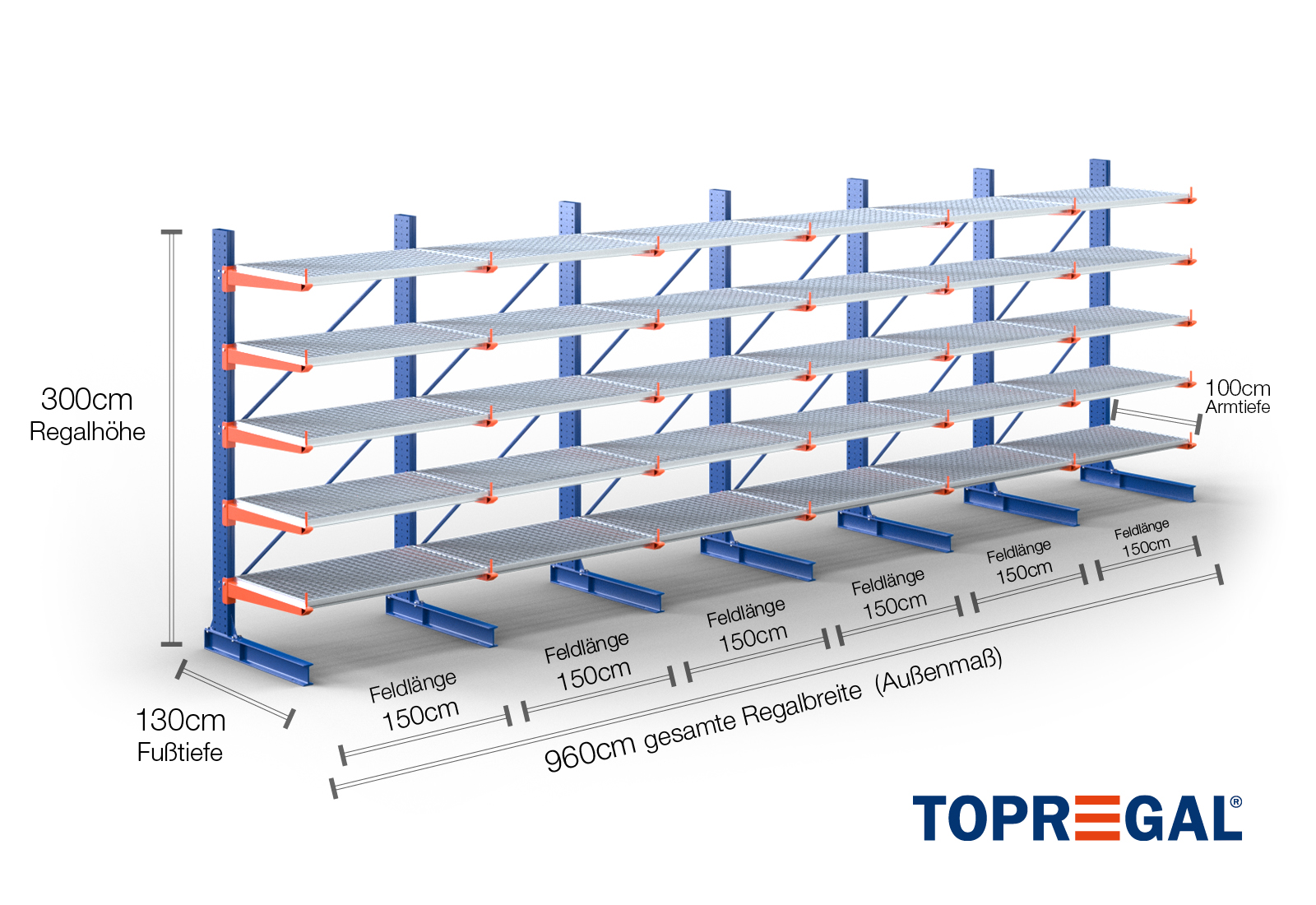 The axial dimension is the internal dimension between two shelf uprights. Depending on the cantilever type, we offer these fields in 120 cm (KR2500) and in 100 cm / 150 cm (KR3000 / KR6000).
