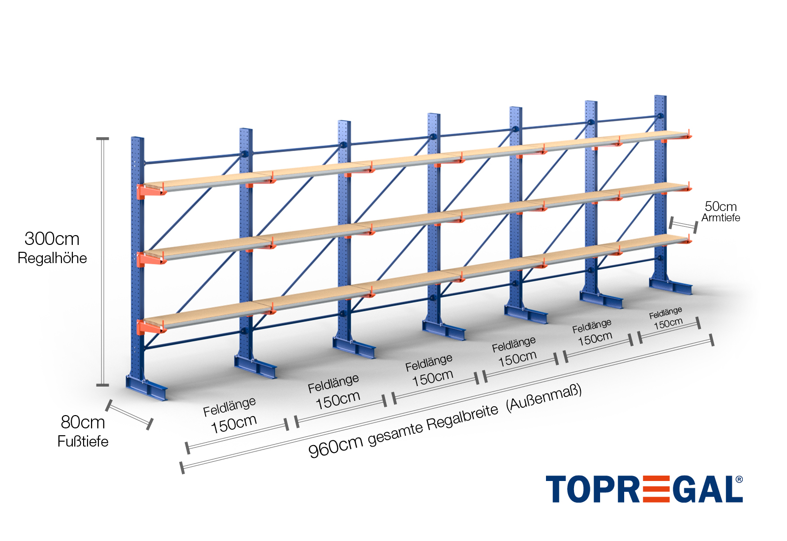 9,6 m cantilever rack KR3000 / Painted / One-sided / 3 m high / 50 cm cantilever depth / 3 levels / rack layer Wood