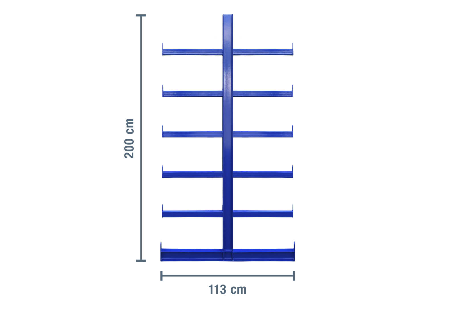 Double-sided, 2 m-high upright for the cantilever rack KR2500 with 50 cm-long, welded-on cantilever arms with a total depth of 113 cm. Maximum load per cantilever 250 kg. Ideal for extending your existing cantilever rack.